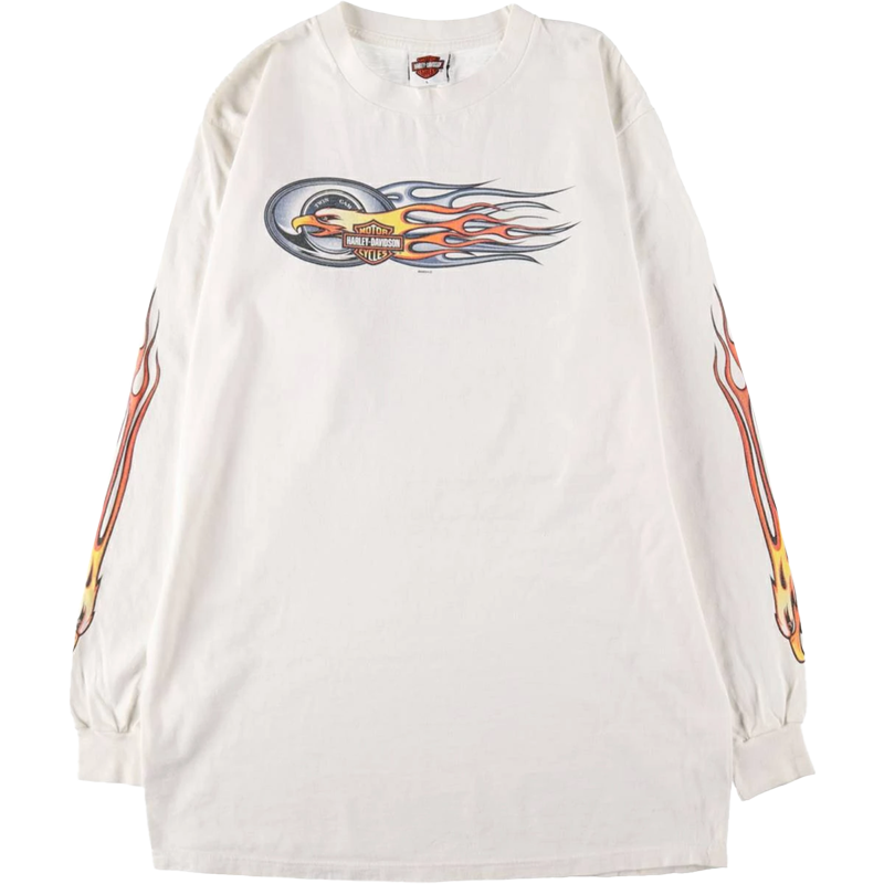 何枚あっても困らないTシャツ。定番の バンドTシャツに加え、今季は モーターTシャツや カレッジTシャツがトレンドです。特に、 ロングTシャツは今の時期にぴったり!なかでも、 ハーレーなどの 袖プリントデザインは存在感があり、一枚でコーデの主役になります。シンプルに着こなすのはもちろん、レイヤードスタイルにもおすすめです!
