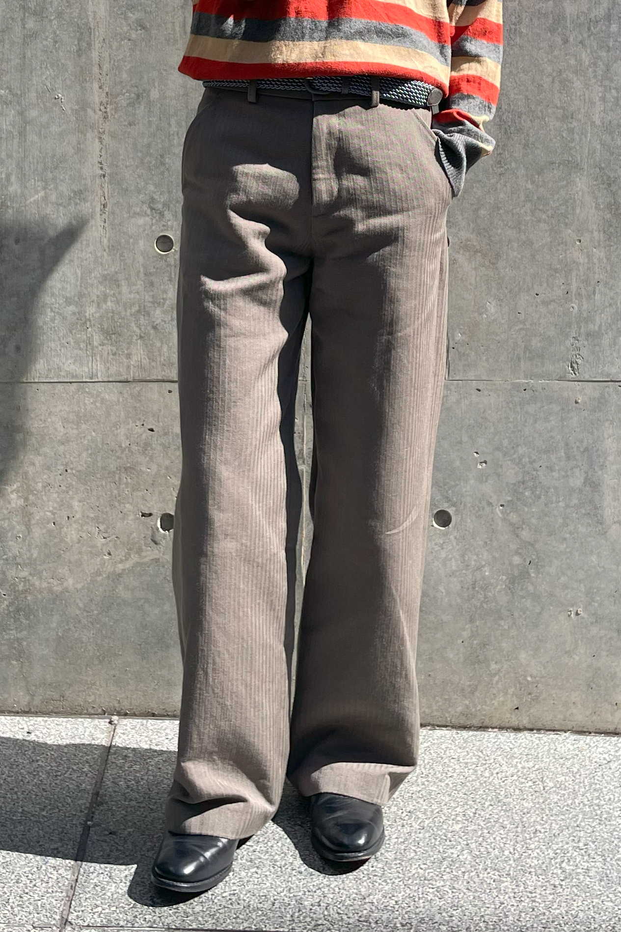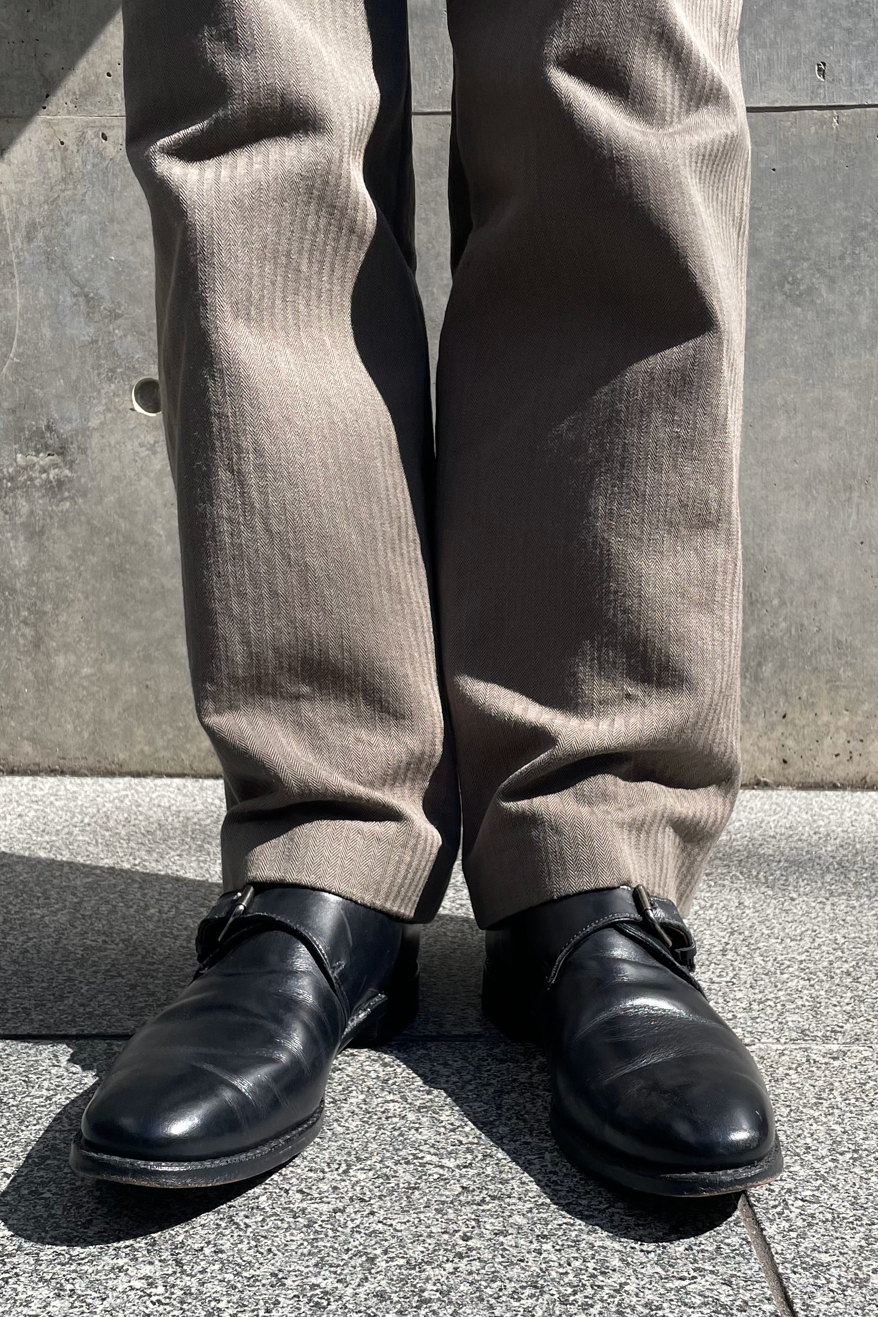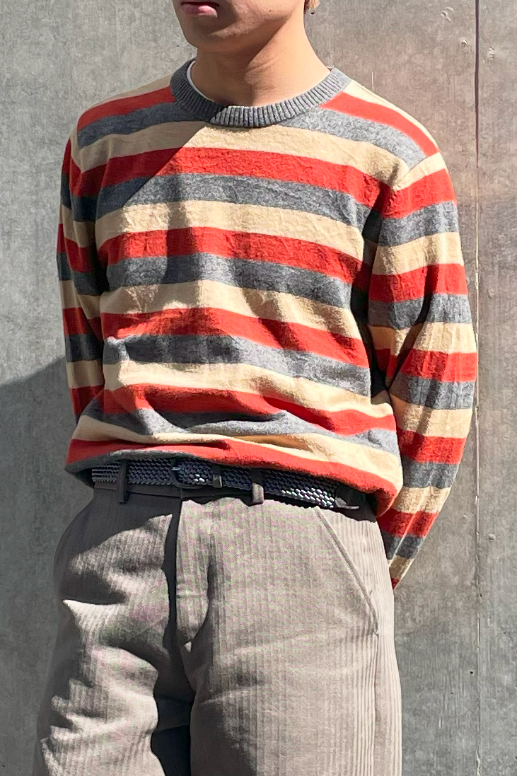 ドレスシーンでよく使われるストレートチップでは無く、ストラップシューズをチョイス。 カジュアルな着こなしに合わせたい時は紐がないストラップかローファーが特におすすめ。 スラックスも太さのあるシルエットでリラックス感を演出。 品のあるニットでもマルチボーダーなどの柄ニットをチョイスする事で、カジュアルな雰囲気を程よく出せる。