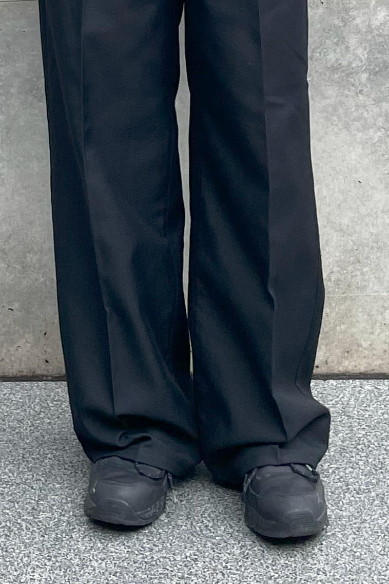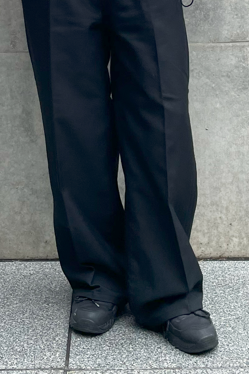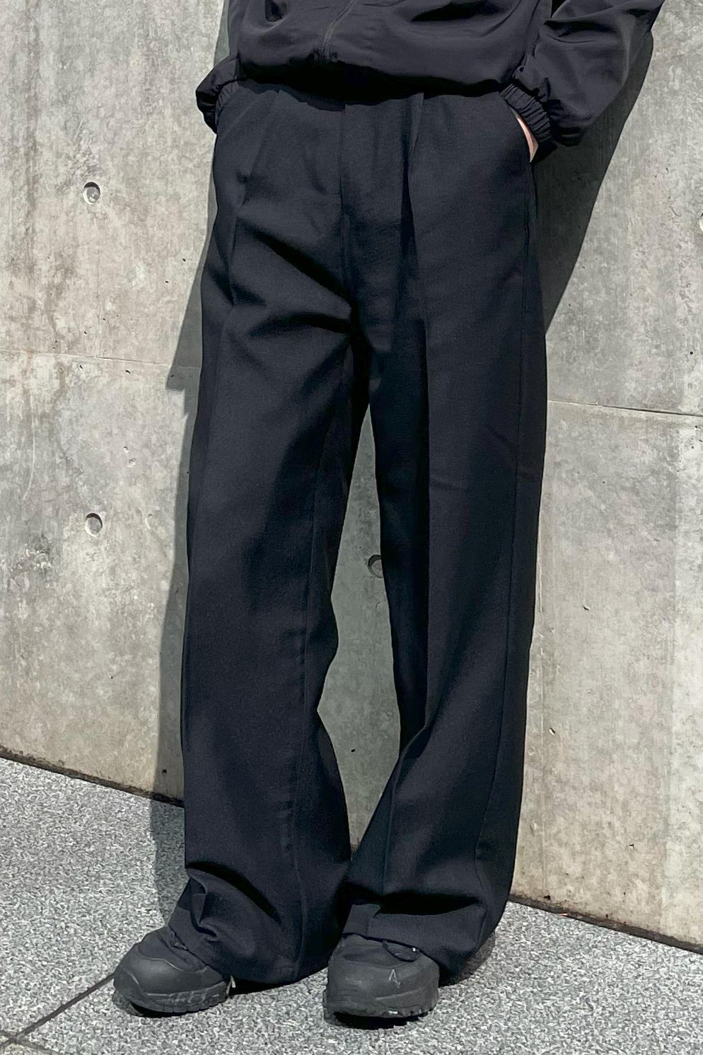カジュアルなスポーツアイテムとは対照的なスラックスで上品さをプラス
