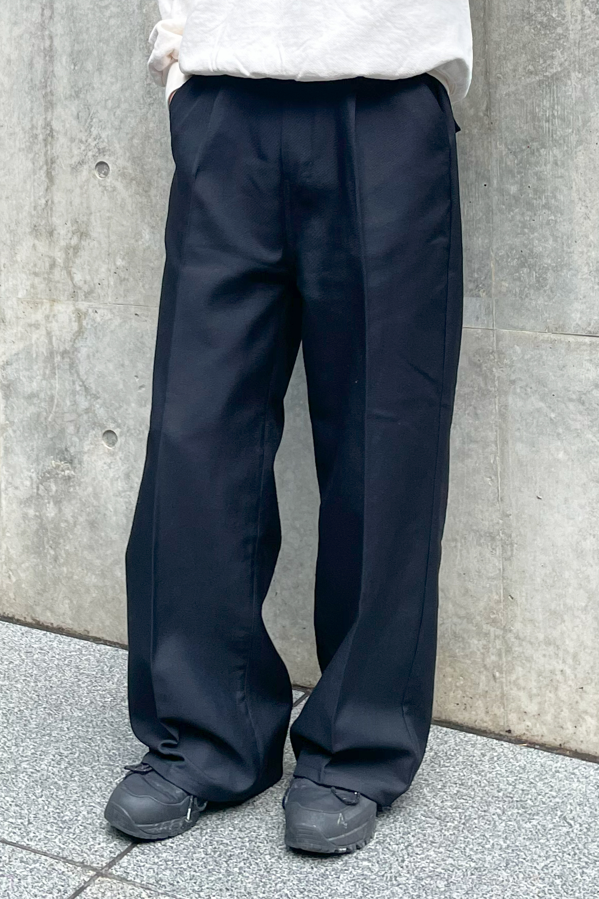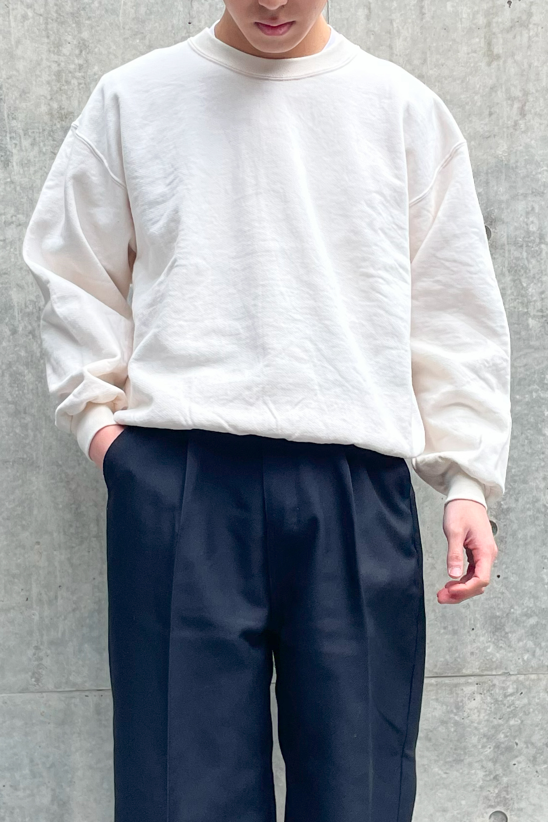 デザインが無い分、シルエットと素材感で勝負出来るアイテム。今はオーバーサイズ過ぎない程よくゆとりのあるサイズ感が気分。 リラックス感のあるルーズなスラックスを合わせる事でスウェットでも充分に大人な雰囲気に。