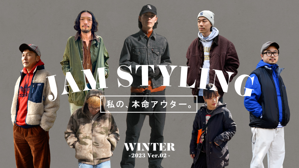 襟のデザインや形状に拘り、スラックスパンツ、ワイドデニム、ナイロンパンツなどを合わせて、差し色に帽子やマフラーを身に着けるのがポイント。