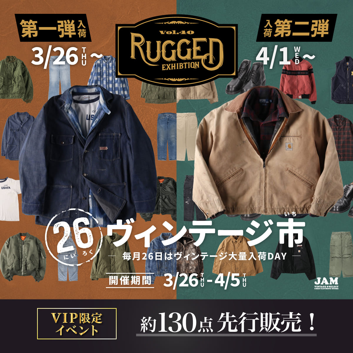 JAM26ヴィンテージ市 “Rugged Edition“ VOL.40 2026 26ヴィンテージ市 2026/3/19 古着とスポーツ -今、あらためて「スポーツ」をファッションに。- 2026 特集 2026/3/12 【ONLINE限定】オリジナルメジャープレゼント ショップニュース 2026/3/6 【入荷】始まる新生活、ラルフと古着デビュー 2026 特集 2026/3/6 【入荷】スマート古着 -ビジネスに馴染み、休日に映える大人の着回し術- 2026 特集 2026/3/6 【求人募集】ECサイト運用スタッフ募集! ショップニュース 採用情報 2026/3/4 3/20(金)から古着屋JAM VINTAGE&SELECT 仙台店にて「JAM CLASSICS」がポップアップイベントを開催! ショップニュース 2026/3/1 EC商品準備スタッフ採用情報 採用情報 2026/2/24 THE STYLE SET American Traditional -迷わず、整う。春を始める大人のアメトラ- 2026 特集 2026/2/19 JAM26ヴィンテージ市 VOL.39 2026 26ヴィンテージ市 2026/2/19